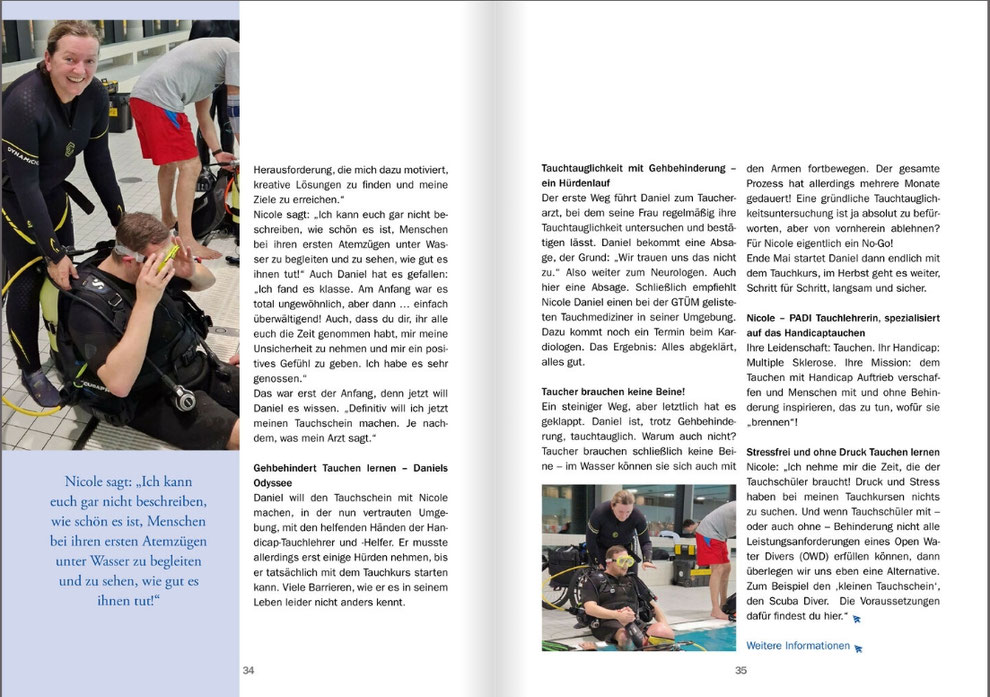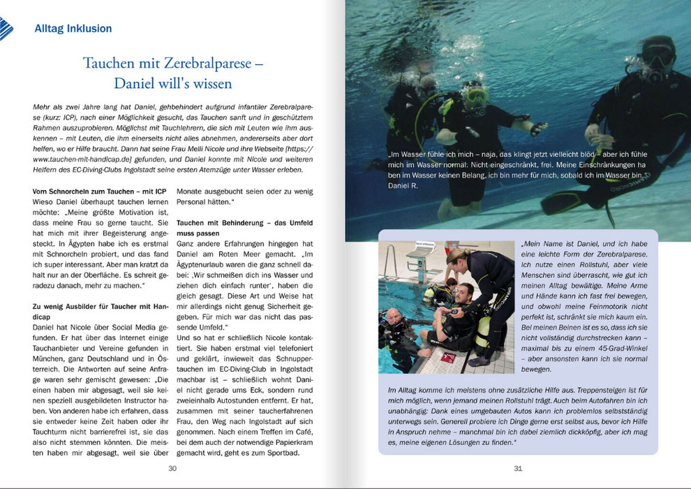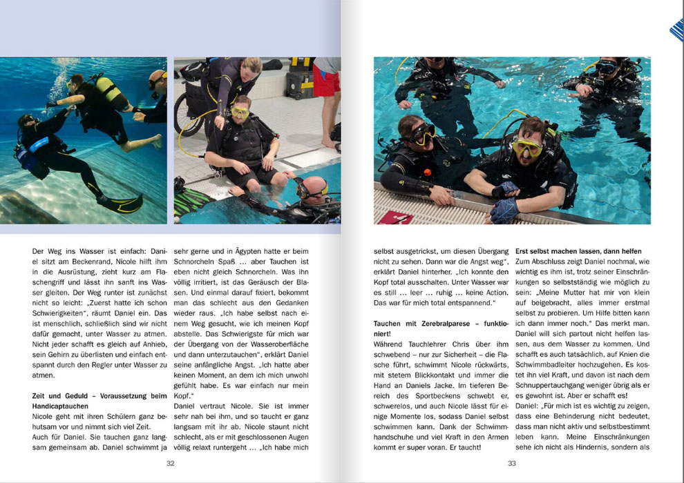 Damit noch mehr Menschen mit Behinderung den Weg zum Tauchen finden, braucht es Multiplikatoren. Sprich: die Presse. Als der VdK Baden-Württemberg angefragt hat, meine Story über den Stuttgarter Daniel mit Zerebralparese und seinen Weg zum Tauchen zu veröffentlichen, habe ich gerne zugestimmt. Mit ein paar textlichen Adaptionen - wie passend beim "Adaptive" Diving - ist Daniels Geschichte nun auch im E-Magazin SBVdirekt zu lesen.