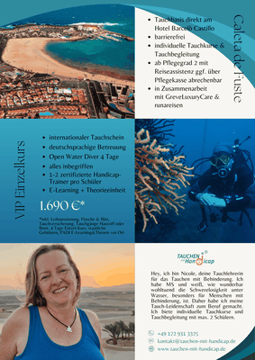 Hier hatte ich die Kurse von DDI (Disabeld Divers International) aufgeführt, doch leider beendet dieser Verband seine Tätigkeit zum Ende 2024. Es gibt nur noch einen Nachfolgeverein, der jedoch ausschließlich in Italien tätig ist. Seeeeehr schade....