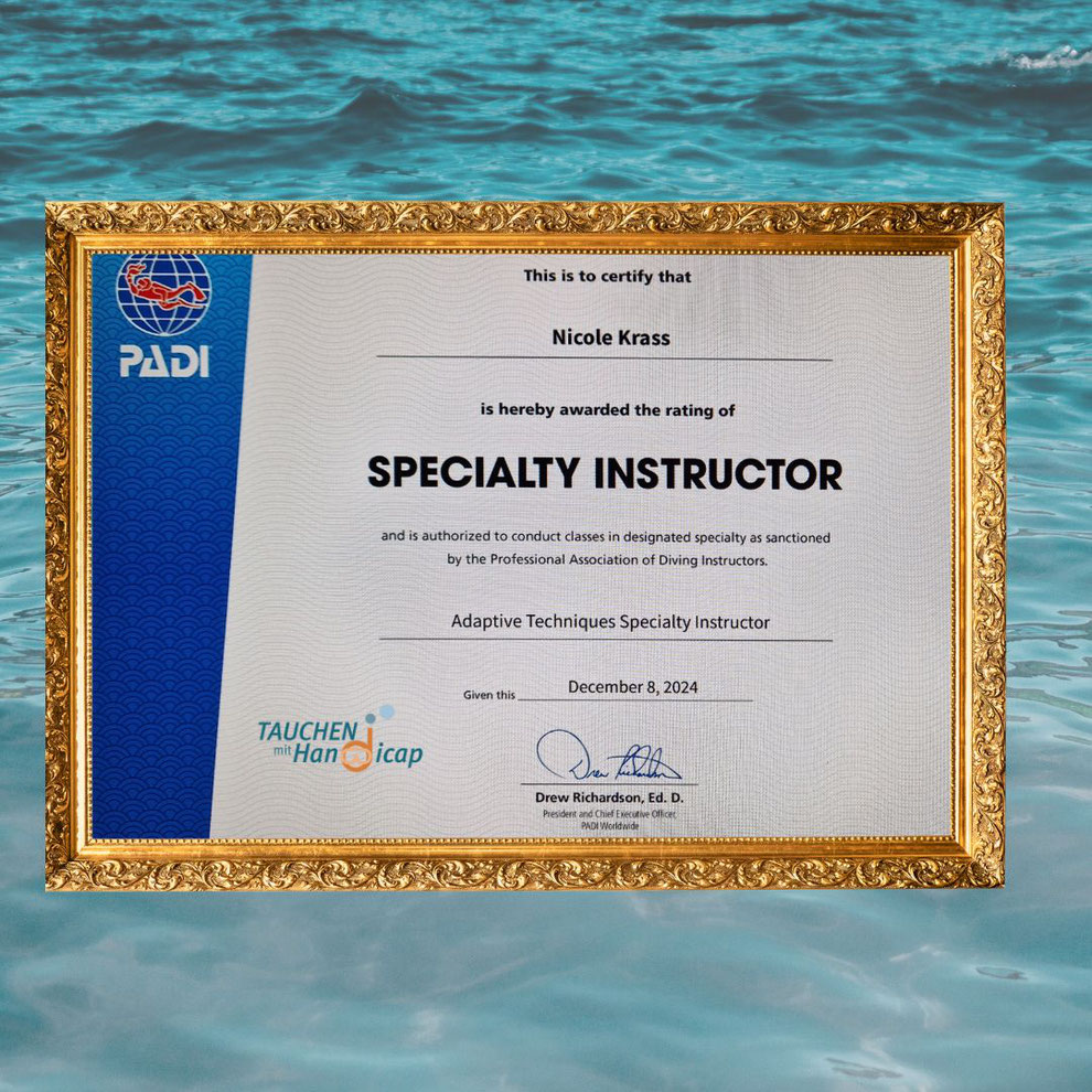Werde zum zertifizierten Adaptive Techniques Diver und profitiere von meinen Erfahrungen mit Tauchern mit Handicap. Gerne bilde ich auch mehrere Staff-Mitglieder deines Divecentes aus - schließlich sollte jede Tauschbasis Personal haben, das im Umgang mit Tauchern mit Behinderung geschult ist.